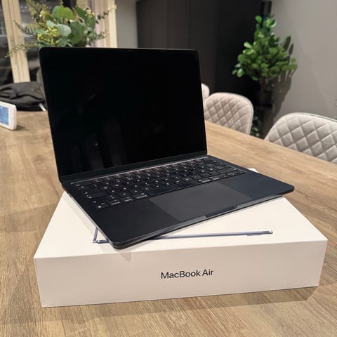 Apple MacBook Air 13 (2022) bærbar PC med 8-kjerners M2 CPU, 8 GB RAM, 256 GB SSD-lagring og 8-kjerners GPU. Farge: midnatt. Inkluderer lader og beskyttelsesetui.