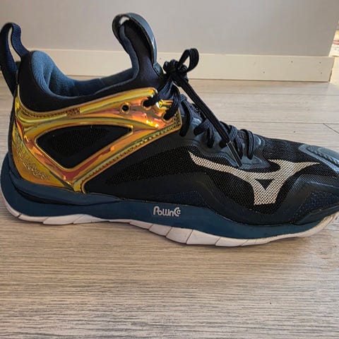 Mizuno Wave Momentum 2 herresko i marineblå og gull. Skoene har snøring og en solid yttersåle. Designet for komfort og støtte ved fysisk aktivitet. 42,5 størrelser
