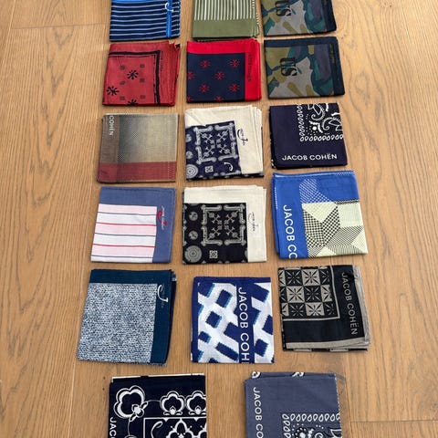 Selger syv stk bandanas fra Jacob Cohen. Ubrukt. 300 kr stk. 50X 50 cm. Lys blå med brune striper litt større ca 54
