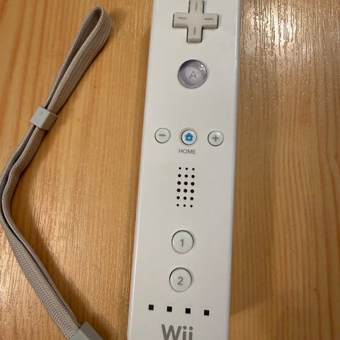 Nintendo Wii fjernkontroll i hvit farge. Inkluderer håndleddstropp og original emballasje. Designet for bruk med Nintendo Wii spillkonsoll.