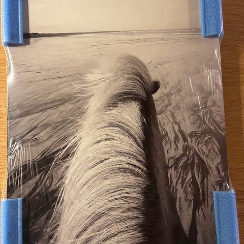 Bilde viser et nærbilde av en hest med lys man og brunt pels. Bildet har en rød filt bakplate.