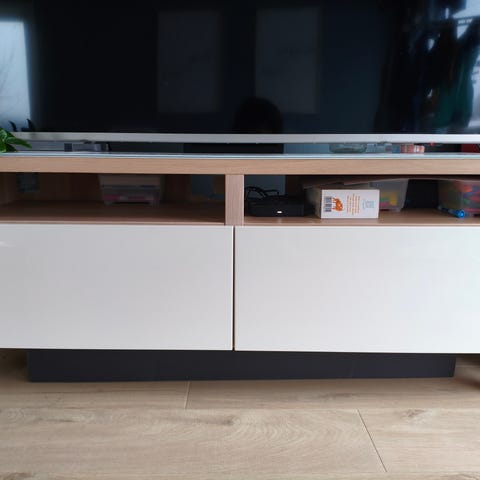 Det er en hvit Ikea Bestå med høyglans skapdører. Det medfølger en glassplate på toppen av benken.