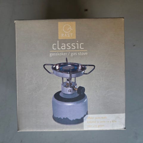 Toppmontert gassbrenner fra Rast med robust konstruksjon. Stort brennerhode som gir jevn varme, piezotenner og utfoldbar kjeleholder.