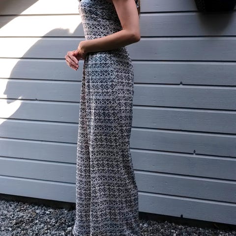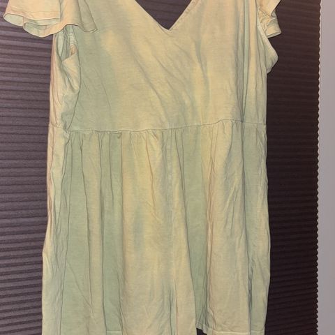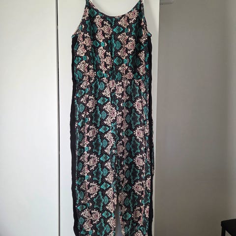 Fin jumpsuit med V-hals, også bak. Knapp på vrangen foran for å lukke omslagsåpningen. Vide ben. Behagelig å gå i. Snørebelte i midjen.
