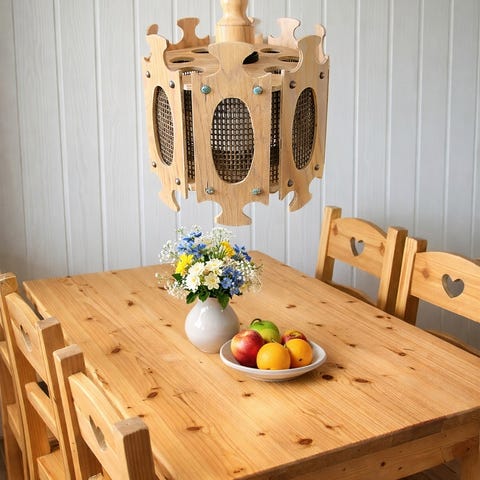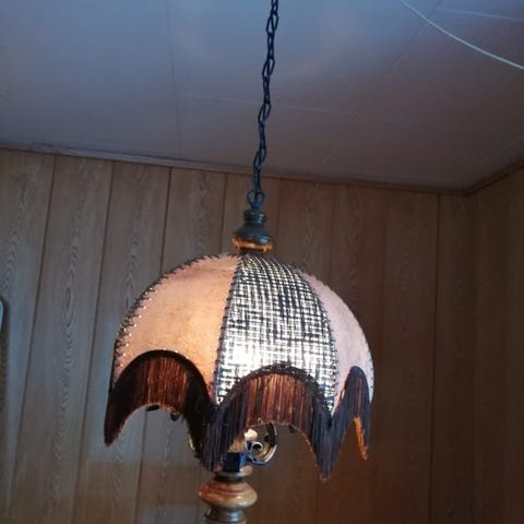 Vintage taklampe i furu fra 60-tallet i skandinavisk design med brodert stoffskjerm.