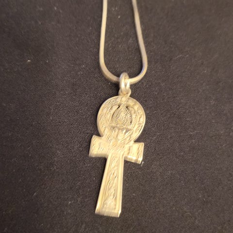 Kjedet er 60 cm langt og kan kortes. Smykket er ca 8 x 6 cm. Bilder med mål.