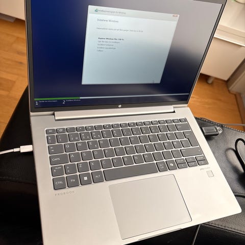 HP laptop i sølvfarge. Bærbar datamaskin med standard tastatur og flere tilkoblingsmuligheter, inkludert USB, HDMI og Ethernet. Designet for generell bruk med fokus på funksjonalitet og bærbarhet.