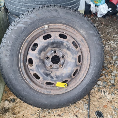 Vinterdekk med pigg på alufelg. Felgene er bra, men dekkene er slitt, lite pigg igjen. De har stått på en 2012 caddy. Men passer til mange VW, audi og skoda mm