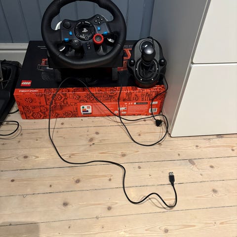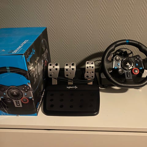 Nesten ubrukt Logitech G29 racingratt med pedalsett. Rattet har flere funksjonsknapper og et ergonomisk design med skinnlignende materiale. Pedalsettet inkluderer gass, brems og clutch med metalloverflater. Produktet leveres med WRC-spillet fra EA Sports til PS5.