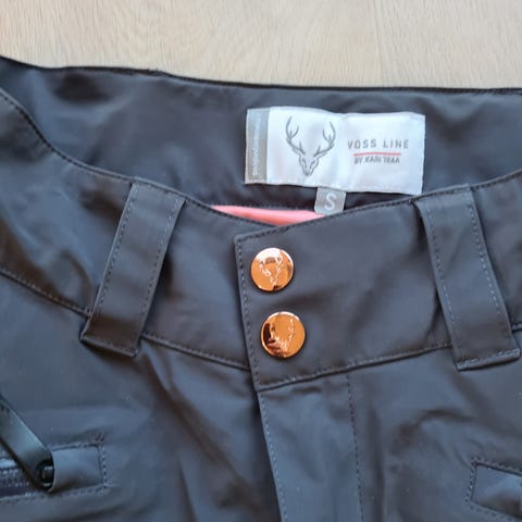 Meget pen stand, eneste anmerkning jeg kan se er en ørliten rift nederst på ene bein (se bilde). Fargen er sort, med grå forsterkning på innersiden av nederste legg. Den har litt utsving i leggene. Normalt til høyt liv, og justerbar vidde i livet. Normal i størrelsen. Vært veldig fornøyd med denne, selges fordi den er blitt for liten.