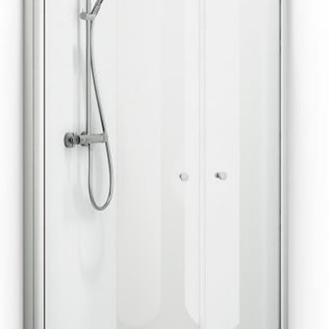 Dusjhjørne med to glassvegger i hjørneoppsett. Inkluderer dusjarmatur med hånddusj og termostatstyrt blandebatteri. Veggene er montert på flislagt gulv og vegg. Passer til baderom med hjørneløsning.