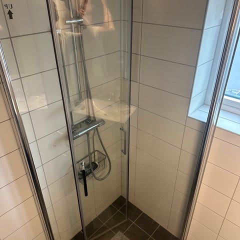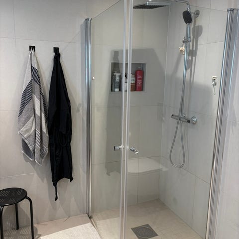 Dusjhjørne og armatur med glassvegger og dusjarmatur
