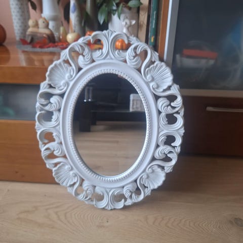 Vakkert ovalt speil med dekorativ hvit ramme.