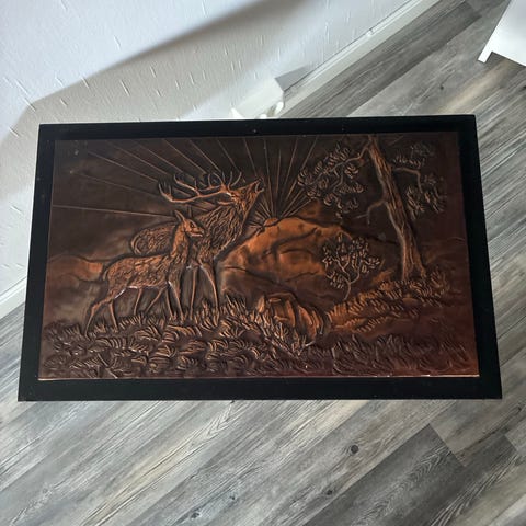Høyden er 50 cm og bredden er 30 cm.Det er størrelsen på plata.Selve bildet er 43 cm høyt og 24 cm bredt.Plata er av teak.Det har veggfeste og ingen skader.Vekta er ca 1800 gram.Det kan hentes hos meg på Tonsenhagen i Oslo eller jeg kan sende det og kjøper betaler porto.