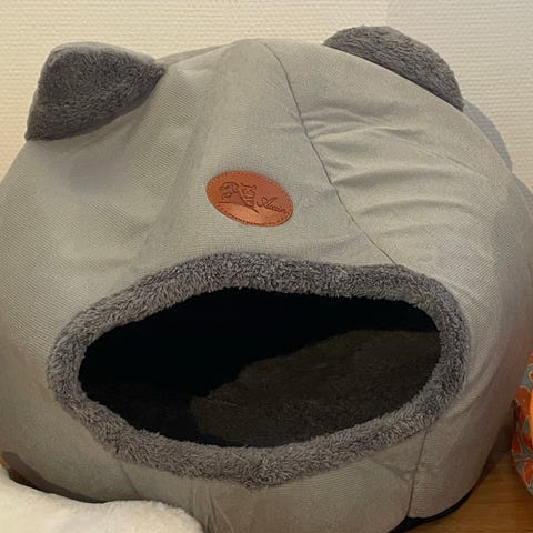 Kattebol laget av filt (ull) i blå farge med to ører. Egnet som et hvile- eller sovested for katter.