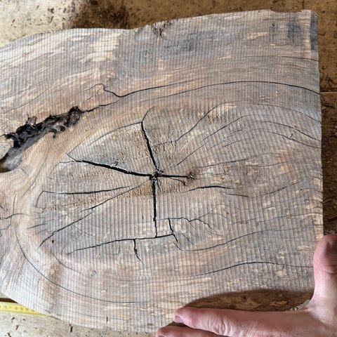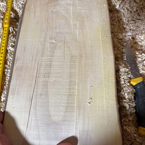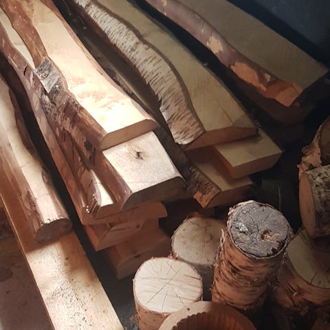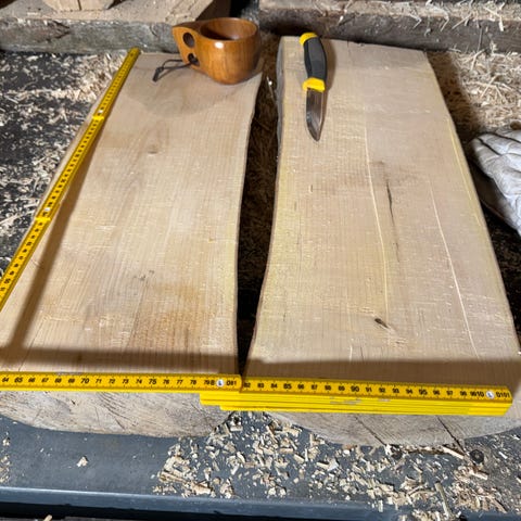 Har 4 emner av bjørk (Betula) igjen; Tørket under tak utendørs opptil 10 måneder. Emnene er opptil 40 cm lange, 20 cm brede og 3-5 cm tykke. Kan passe bra til å lage serveringsbrett, skjærefjøler og lignende. Bjørk har antibakteriell virkning, så de er veldig bra til det formålet. Kan også brukes til å lage skilt som ‘Hytta’ etc. Solide emner som er ca 3-4 kilo per stykk.