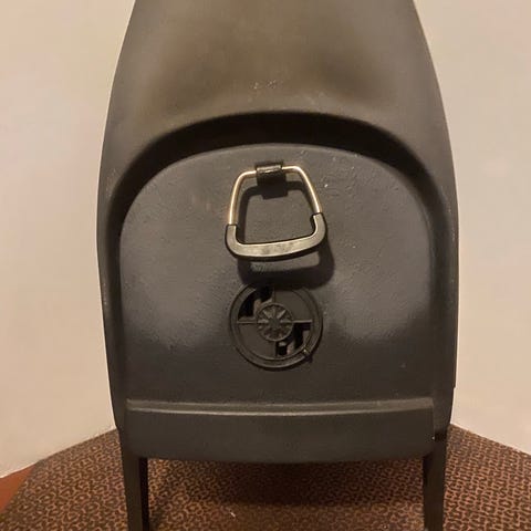 Jøtul vedovn laget i støpejern med dekorative relieffer. Sprekker på sidene