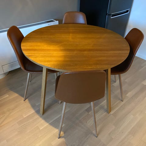 Selger fem meget pene klassiske danske designstoler. Har hatt disse rundt spisebord i mange år. De er veldig gode å sitte på. Sittehøyde 46. Kan stables. For noen år siden fikk jeg de spraymalt hos et profesjonelt firma. Farge turkis eller petrolium blå. Stolene fremstår som veldig lite slitt. Du kan lese mer om stolene her: https://hudevadfurniture.com/products/chairs/rondo-chair/
