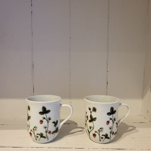 Selger 2 stk krus fra Porsgrund Porselen, begge med det klassiske Jordbæreng-mønsteret.