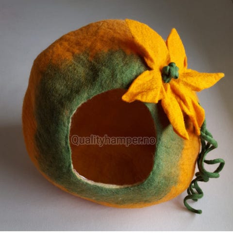 Håndlaget kattehule i filt med tre- og prikkemønster