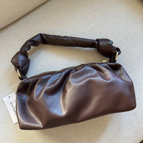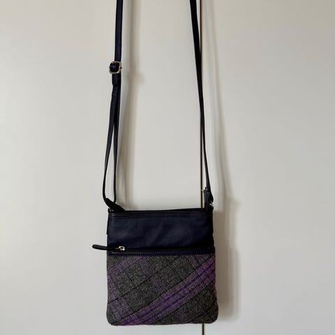 H&M Dame skulderveske laget av lær i lilla farge. Vesken har en dekorativ lenke som skulderrem og et romslig hovedrom med glidelås. Egnet for daglig bruk og ulike anledninger.