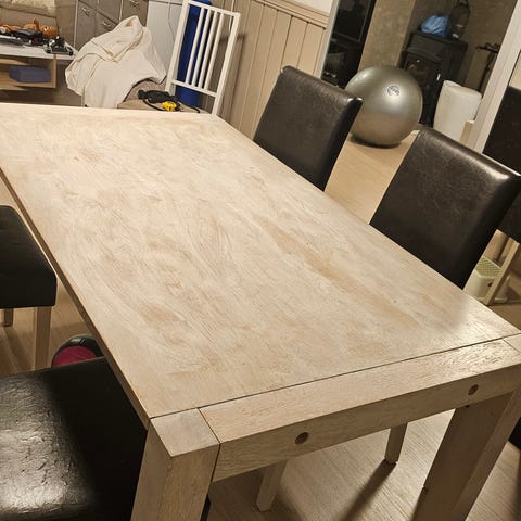 Spisebord i eik med tilleggsplate for utvidelse. Bordet har en naturlig treoverflate, noe slitasje, men i god stand. Medfølgende stoler i mørk trefarge med puter på setet. Passer til spisestue. Stoler er aldri brukt uten pute. Må hentes i Løten.