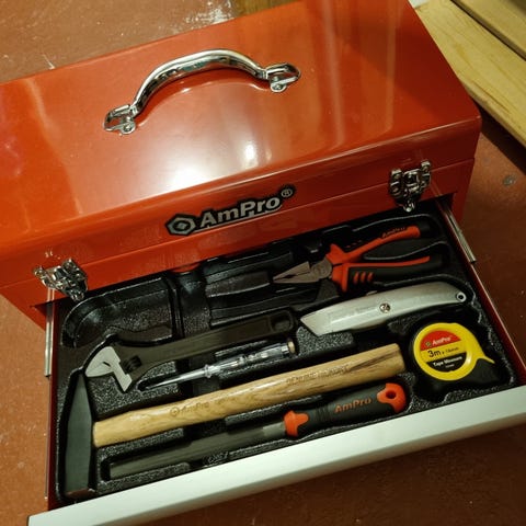 Verktøykasse med flere skuffer og topp lokk for ytterligere oppbevaring. Det er 6 skuffer. Nøkkel lås til å låse av hele kassen.