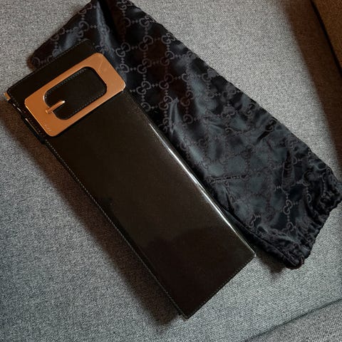 Clutch i Gucci-inspirert design. Vesken er ikke en original merkevare, men en veske med monogrammønster og dekorativ spenne i front. Den er pent brukt og fremstår i god stand, med praktisk plass til nødvendige eiendeler som mobiltelefon, lommebok og småting.
