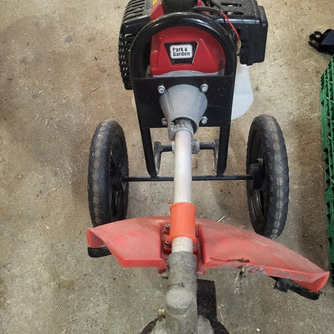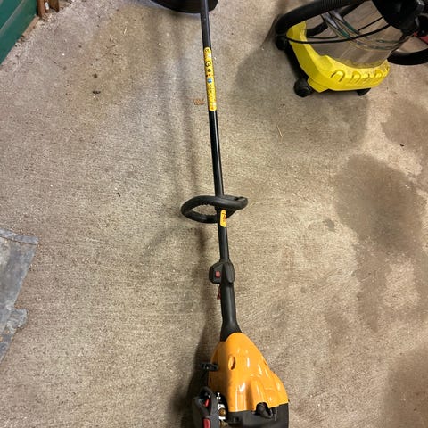 Begagelig å bære på ryggen, men dessverre er den fleksible wirearmen til gresstrimmer / kantklipper ødelagt pga varmgang. Ingen garanti på motor siden den har stått ubrukt i mange år. Kanskje motoren kan brukes til gocart?