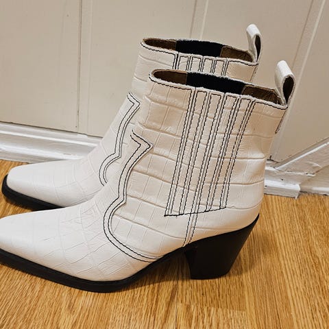 Cowboyboots i skinn med broderte detaljer. Fra GANNI, kjøpt i 2025, brukt en gang på ett howdy arrangement.