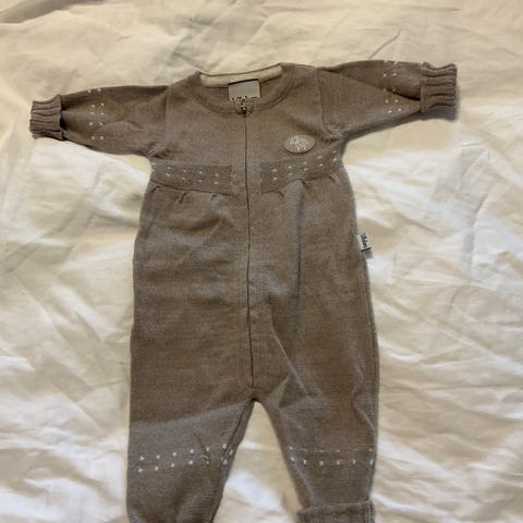 Lillelam sparkedress i 100 % tynn merinoull, modell classic. Dressen har brettekanter på ermer og ben som kan brettes ned når barnet vokser. Kan vaskes i maskin på ullprogram. Kun brukt to ganger. Nypris 699 kr.
