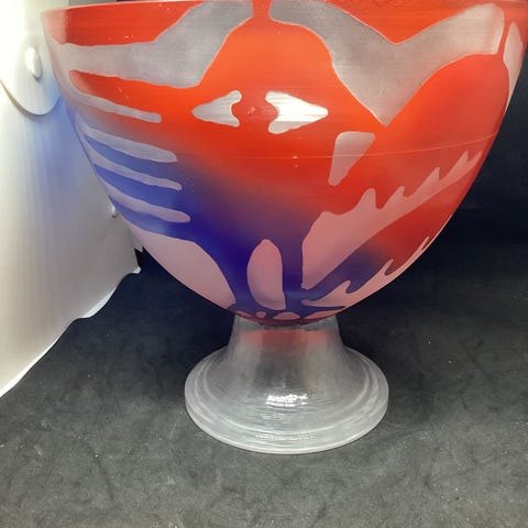 Selger en unik og dekorativ kunstglasskål med hank, designet av den tyske glasskunstneren Peter Kaspar.