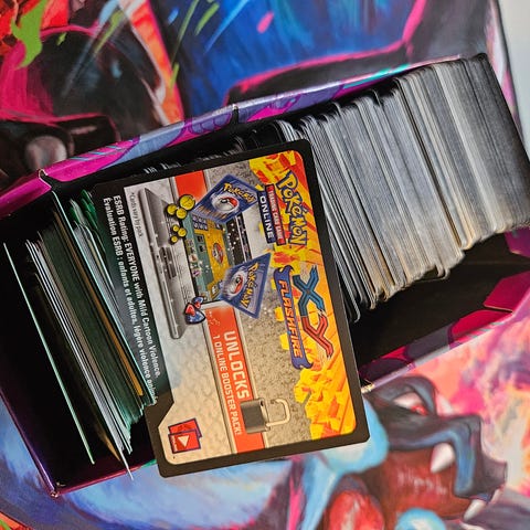 Rundt 750 kodekort til Pokemon Online TCG. Fra en haug med ulike Mega Evolutions, Scarlet & Violet og Sword & Shield sett.