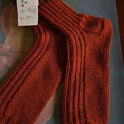 Hjemmestrikket i ull. Heller stor enn liten i str.