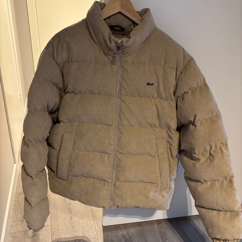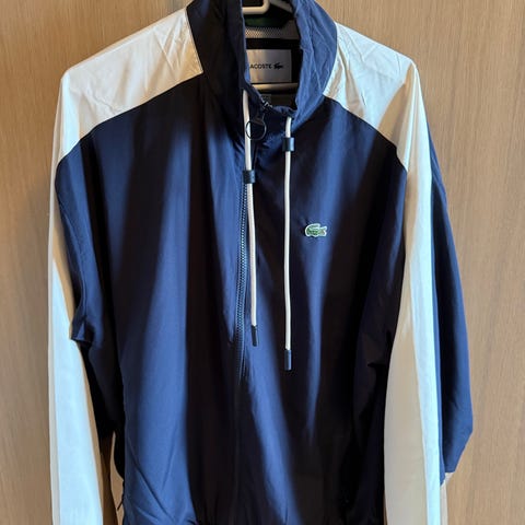 Lacoste jakke i blå farge, størrelse L for herre. Laget av polyester materiale. Jakken er egnet for utendørs bruk.