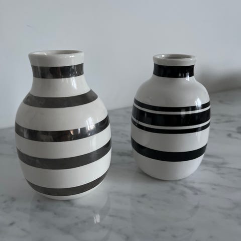 Kähler vase med dekorative horisontale striper i hvitt og sølv. Laget i keramisk materiale. Passer til dekorasjon og oppbevaring av blomster.