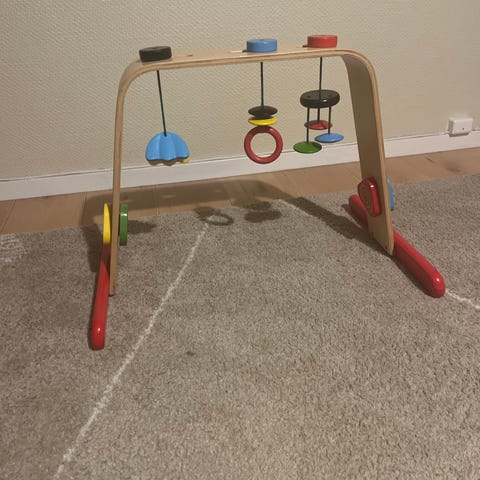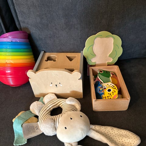 Putteboks i tre og stabletårn i papp med dyr i tre. Pent brukt, men pappboksene til stabletårnet har noen bruksmerker. Se bilder.