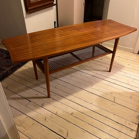 Selger det fine salongbordet mitt på grunn av plassmangel i ny bolig. Fargen på de to siste bildene er mer representativ. Trenger litt kjærlighet på selve bordplaten (se bilder) - jeg har ikke giddet å pusse ned og olje selv, men forrige eier gjorde det med hell tydeligvis.