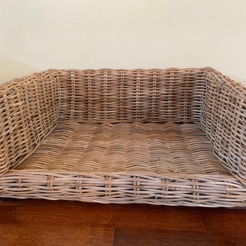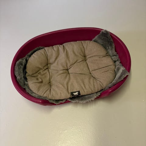 Hundeseng i brun og beige stoff med mønster. Rund form med polstret kant og myk innside. Egnet som hvile- og soveplass for hunder.
