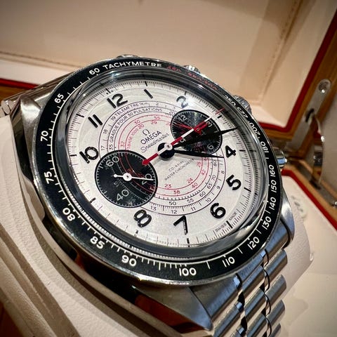 Garanti til 19.02.2027 (5år). Pent brukt, små bruksmerker. 43 mm. Skiven viser skala for både telemeter (beregning av avstander) og pulsometer (pulsmåling). I tillegg har den tachymeterskala på bezelring for måling av fart. Klokkekassen er klassisk Speedmaster og inni sitter et av de nyeste egenproduserte urverk fra Omega med manuelt opptrekk. Verket er selvsagt in-house Omega, både METAS- og COSC-sertifisert. Alt av bokser og kort, kjøpt på Protid i Sandefjord. Nypris ca 125.000.