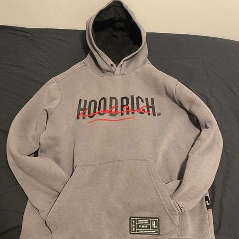 Hoodrich Hoodie i størrelse L for herre. Laget av polyester og har en grå farge. Designet inkluderer hette og glidelås foran.