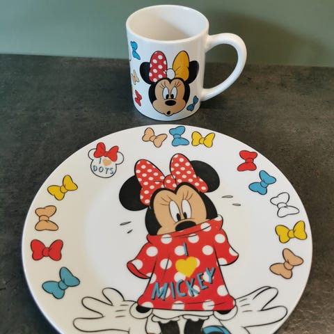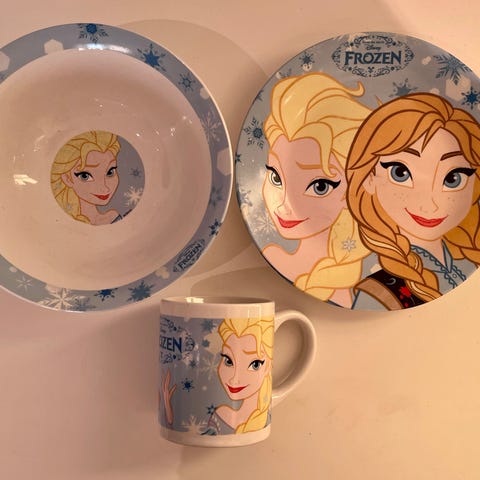 Asjett og kopp med Elsa og Anna fra Disneyfilmen Frost. Normal slitasje etter bruk, hele og fine.