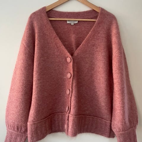 Selges da den ikke ble brukt. 70% polyester og 30% ull. Fargen er lys blå, selv om den ser grå ut på bildet.