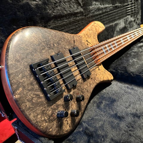 Aktiv elektronikk med separat volum for hver av pickupene og bass/diskant. Preamp og pickuper fra F.G.I. technology. High mass strengestol utviklet av Fernandes. All hardware er svart, noe som er en fin kombinasjon til kroppen i tranlucent blå (litt varmere blåtone enn det som framkommer av bildene). Kroppen er av sumpask.