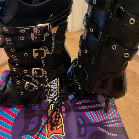 Selger ett par NYE lårhøye støvletter i lakk i rødt i merket Giaro i størrelse 42 (det står 43 i de, men de var for små til en som bruker 43 og passelig til en som bruker 42)!