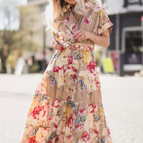 Den har løs passform med fint fall på skjørtet. Den har lange armer og lommer i sidene. Går til midt på låret. Veldig behagelig på!