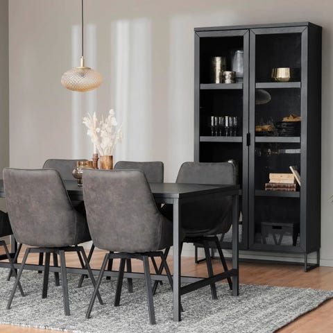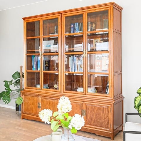Skapet er pent brukt. Har noen hakk/ bruksmerker på gulvlisten og en liten brist helt nederst i det ene glasset. Er lite synlig.