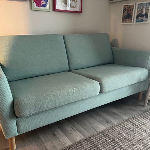 Hel og pen sofa fra Ikea i grønn stoff. Pent brukt, kjøpte ny i september 2023. Ben er 15cm høy. Selges til 1000kr.