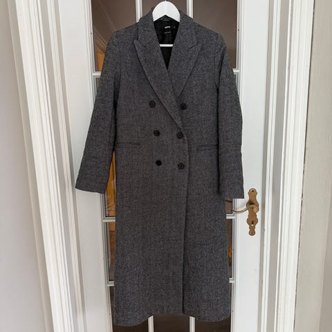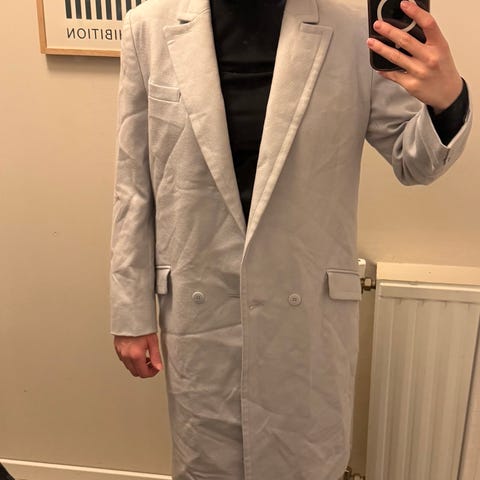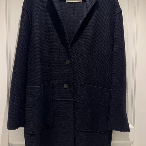 Flott kort kåpe med 51% ull. Din marineblå farge og gyldene knapper. Kan sendes eller hentes på Ensjø i Oslo.