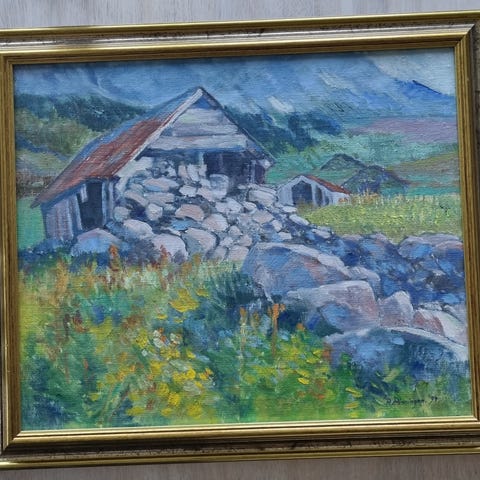 Maleriet har tittelen "Fra Søndre Land" og måler 36x45 cm + ramme.